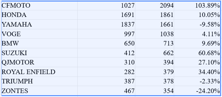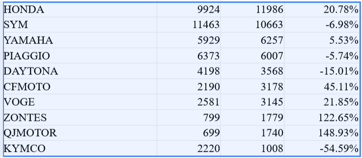Θετικό πρόσημο και μάλιστα πολύ δυνατό έχουν οι κινέζικες εταιρίες στην Ελλάδα: CFMoto (+45%!), η Voge (+22%), η Zontes με ένα τεράστιο +122%, αλλά και η QJMotor με ένα ακόμα πιο μεγάλο +149!