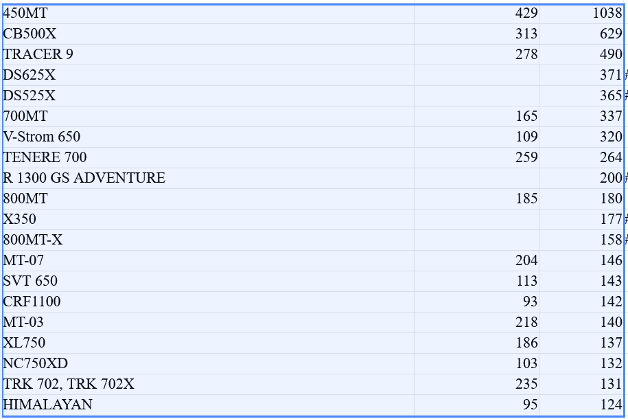 490 κομμάτια ταξινόμησε το Yamaha Tracer 9, αφήνοντας πίσω στην τέταρτη θέση το Voge DS625X που τελικά ξεπέρασε το αδελφάκι του DS 525X, για ελάχιστα κομμάτια. 371 μονάδες είχε το πρώτο και 365 το δεύτερο.