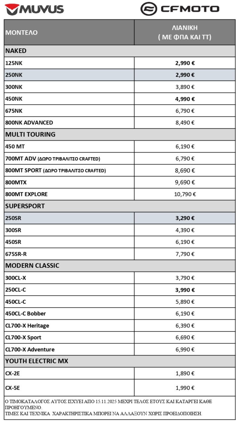 Η CFMOTO Hellas  ανακοινώνει τον νέο τιμοκατάλογο,  που θα ισχύσει από 15 Νοεμβρίου 2025 έως και το τέλος του 2025.
