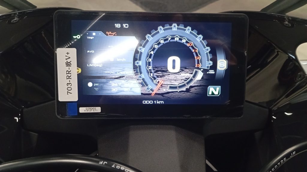 Το βάρος στα 196 κιλά με γεμάτο το ρεζερβουάρ των 16 λίτρων την τοποθετεί στη «μεσαία» πλευρά της κατηγορίας, ενώ τα 1.450 mm μεταξόνιο και τα 820 mm ύψος σέλας δείχνουν ότι η 703 RR δεν επιδιώκει εξτρεμιστική γεωμετρία αλλά μια πιο ισορροπημένη προσέγγιση.