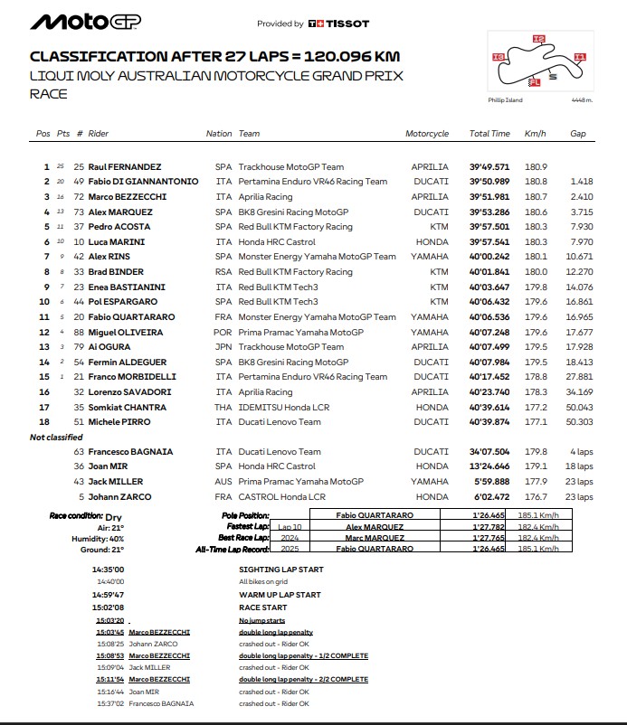Πέμπτος διαφορετικός νικητής στη σειρά και αυτή τη φορά ήταν ο Raul Fernandez που κατάφερε, με μια αψεγάδιαστη εμφάνιση στο Phillip Island, να έρθει πρώτος στη μεγάλη κατηγορία και να χαρίσει ταυτόχρονα στην Trackhouse την πρώτη της νίκη. Κείμενο: MGP Guru