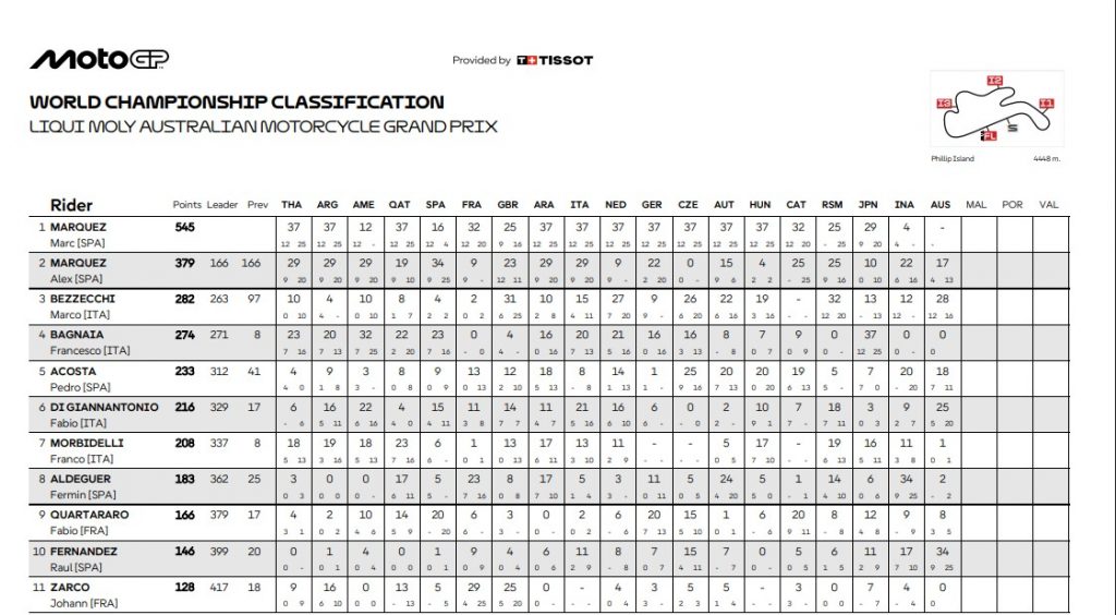 Με το αποτέλεσμα αυτό και σε συνδυασμό με την πτώση του Francesco Bagnaia στην έκτη στροφή (ο Bagnaia συνέχισε να αντιμετωπίζει προβλήματα με ταλαντώσεις καθόλη τη διάρκεια του τριημέρου), ο Bezzecchi ανέβηκε στην τρίτη θέση της βαθμολογίας του Παγκοσμίου Πρωταθλήματος.