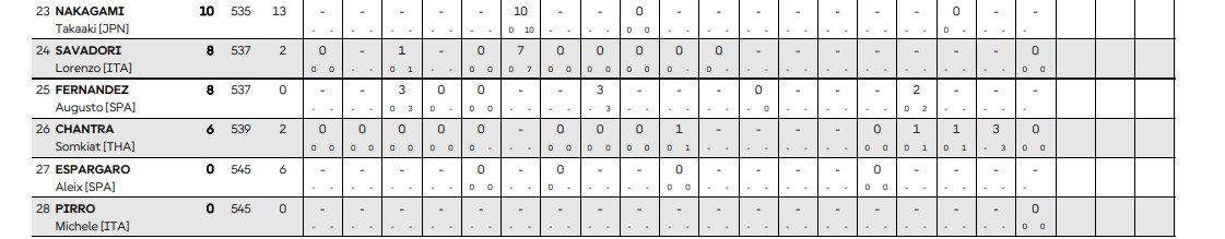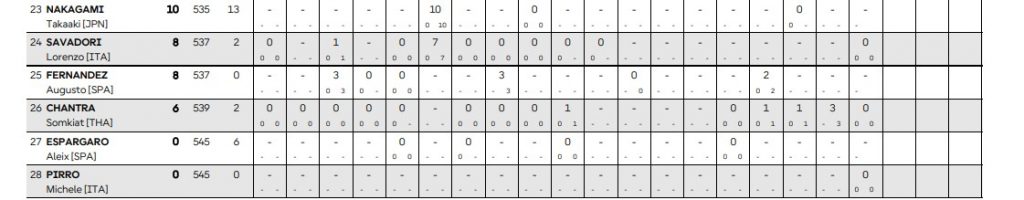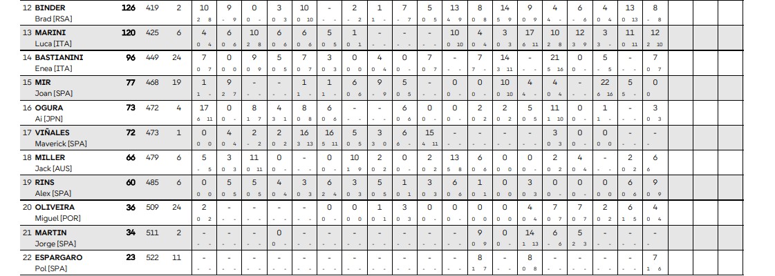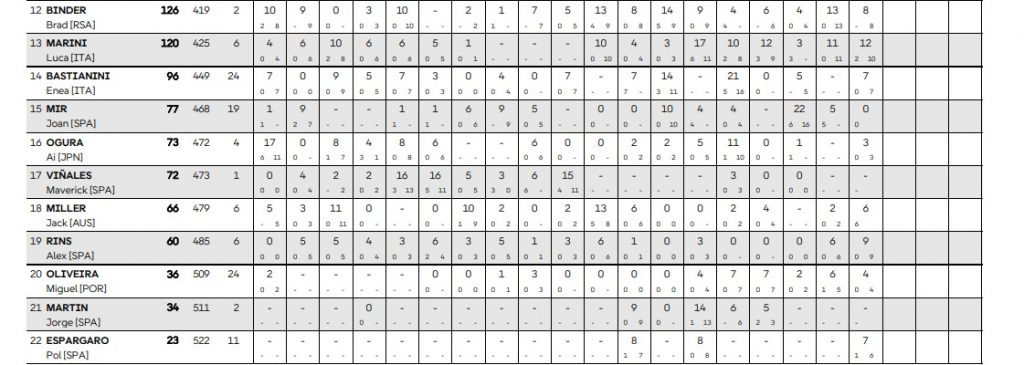 Εν τω μεταξύ, πίσω από τον Acosta βρισκόταν ο Alex Marquez, ενώ και ο Fabio Di Giannantonio πέρασε τον Quartararo για να ανέβει στην τέταρτη θέση.