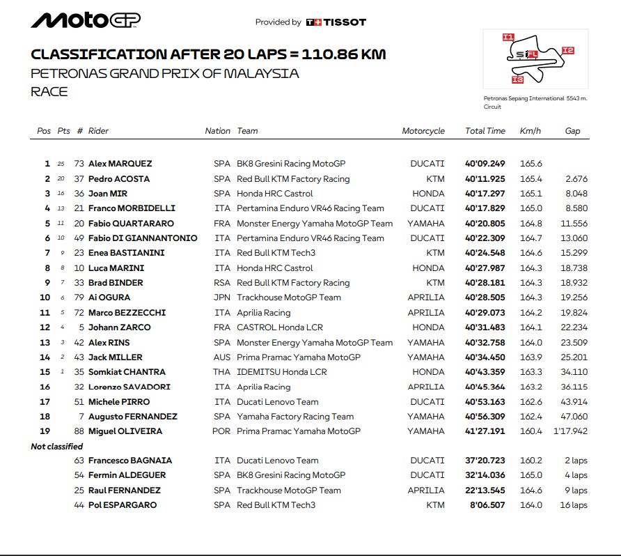 MotoGP 2025, GP Μαλαισίας, Αποτελέσματα