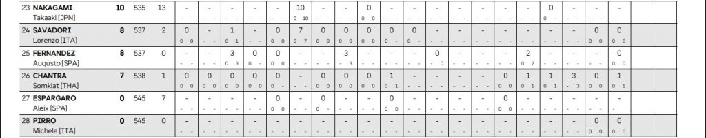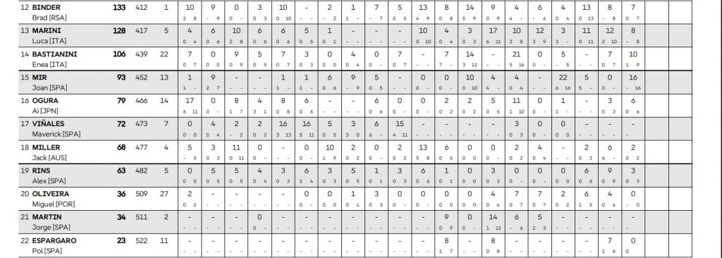 Την πρώτη δεκάδα συμπλήρωσαν οι Fabio Di Giannantonio, Enea Bastianini – που έκανε εντυπωσιακή ανάκαμψη από την 19η θέση στην εκκίνηση – Luca Marini, Brad Binder και Ai Ogura.