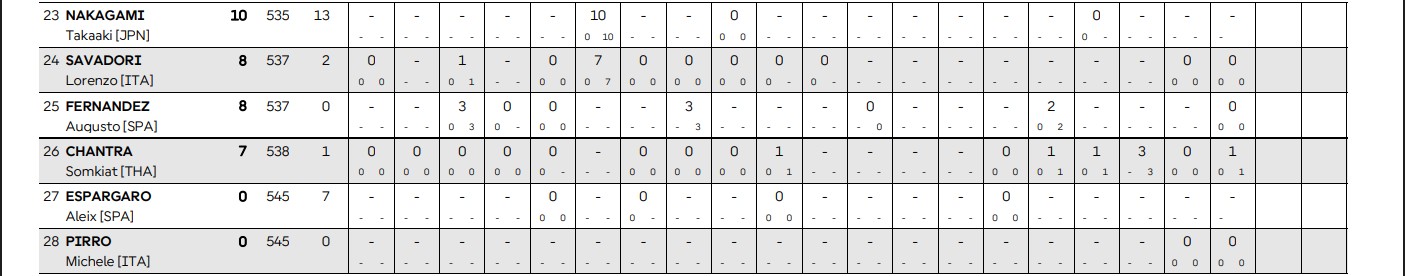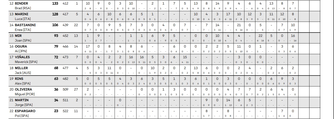 Την πρώτη δεκάδα συμπλήρωσαν οι Fabio Di Giannantonio, Enea Bastianini – που έκανε εντυπωσιακή ανάκαμψη από την 19η θέση στην εκκίνηση – Luca Marini, Brad Binder και Ai Ogura.