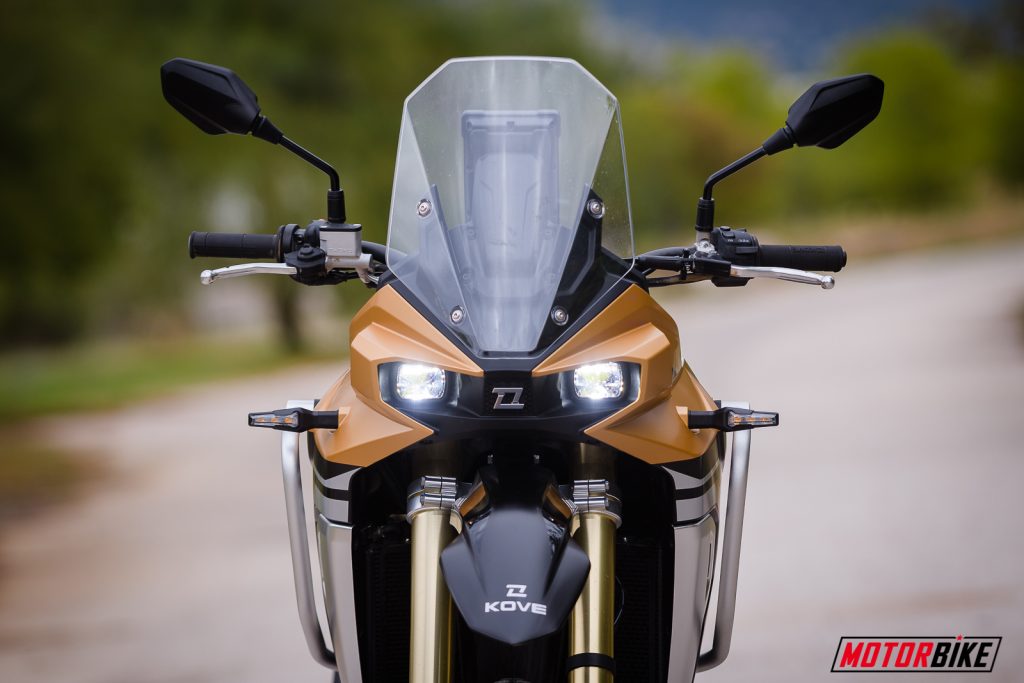 Η πρόσοψη της μοτοσυκλέτας ξεχωρίζει αμέσως. Οι δύο LED προβολείς, σε σχηματισμό “ματιών αρπακτικού”, δημιουργούν μια εντύπωση αποφασιστικότητας και δυναμισμού, δίνουν χαρακτήρα στην Kove και δεν αφήνουν κανέναν αδιάφορο.